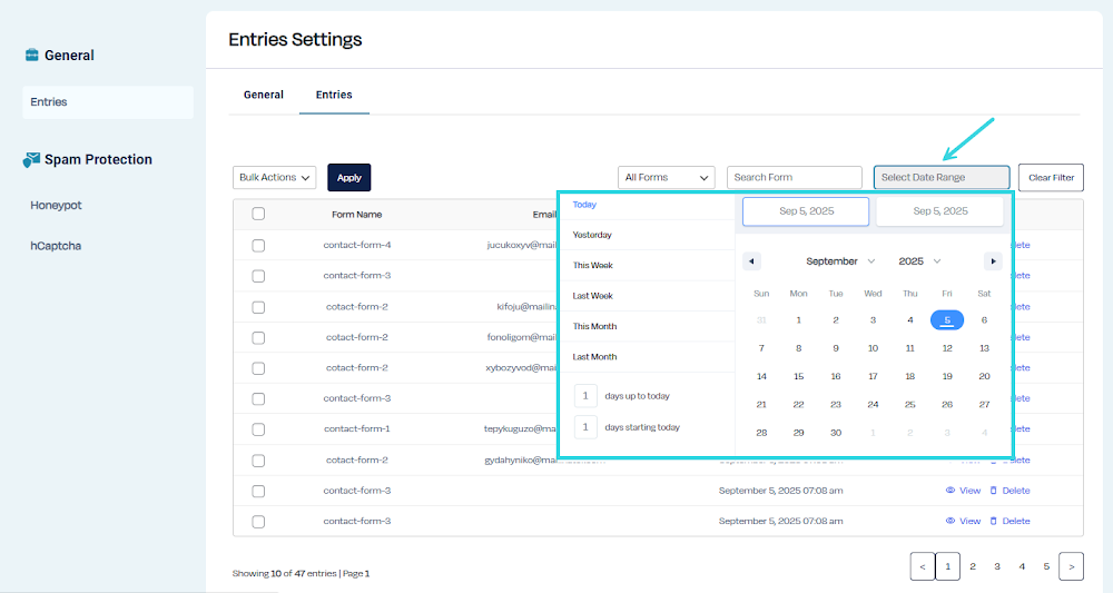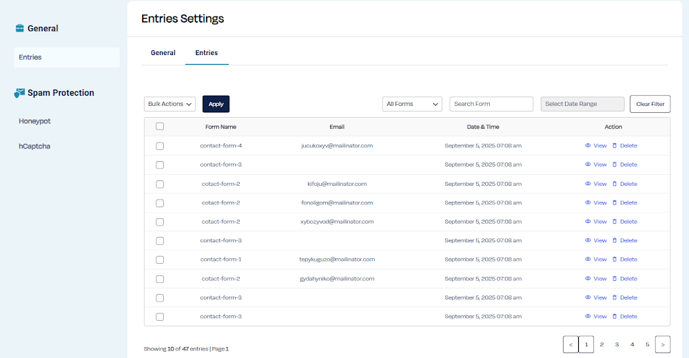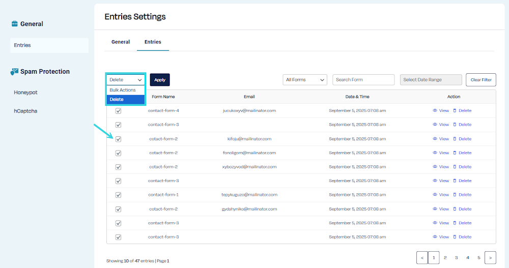 - To Bulk Delete entries, click on the Bulk Actions dropdown, select Delete, and choose the forms you want to delete.