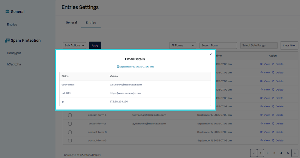 - In the entries tab, you can view all Contact Form 7 submissions.